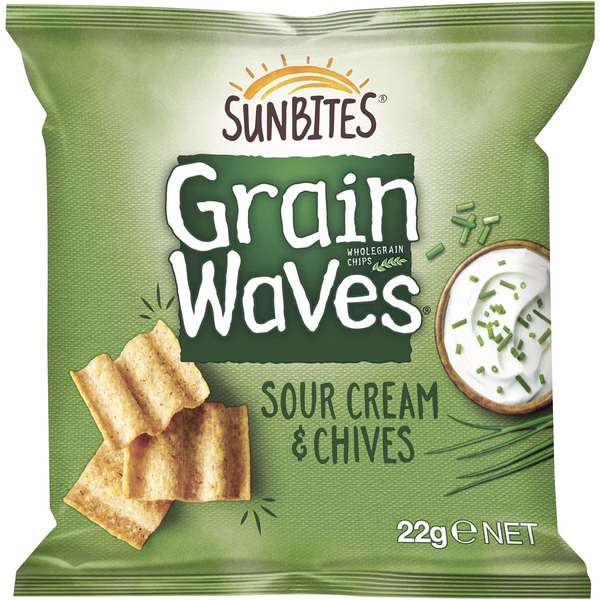 Sunbites Grainwaves Sour Cream & Chives Multipack x 12 provides a wholesome snacking option made from wholegrain ingredients. Each pack delivers the rich taste of sour cream combined with the subtle zing of chives, creating a satisfying crunch in every bite. Ideal for lunchboxes, picnics, or a quick snack, these chips are a tasty choice for those seeking a flavorful and convenient treat.